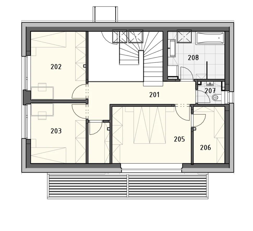 V přízemí je navržena obytná zóna s obývacím pokojem a kuchyňským koutem, technická místnost, koupelna, pokoj pro hosty a praktická spíž. Centrální chodba je otevřená až do výšky podkroví a spojuje veškeré místnosti se schodištěm. V patře jsou umístěny dva dětské pokoje, koupelna, šatna, sklad a samostatné WC.