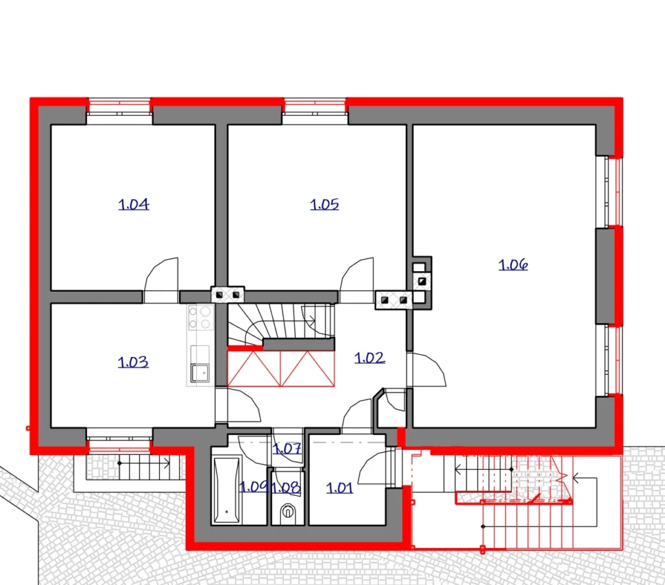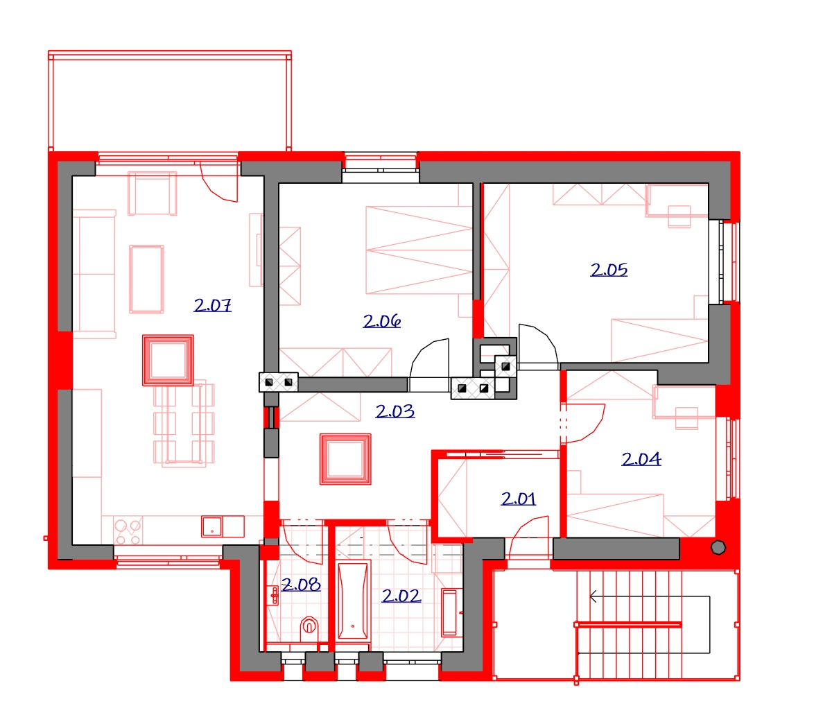 Díky stavebním úpravám vzniknou v domě dvě samostatné bytové jednotky – jedna v přízemí pro dvoučlennou domácnost a druhá v druhém nadzemním podlaží pro čtyřčlennou rodinu. Vstup do horního bytu bude řešen přes nové venkovní schodiště, čímž se zvýší soukromí obou domácností. V interiéru 2NP vznikne nová koupelna s WC, doplněná otevřeným obytným prostorem s kuchyní a jídelnou orientovanou na sever. Dispozice přízemí zůstává zachována, pouze dojde k uzavření stávajícího schodiště a jeho praktickému využití formou úložného prostoru.