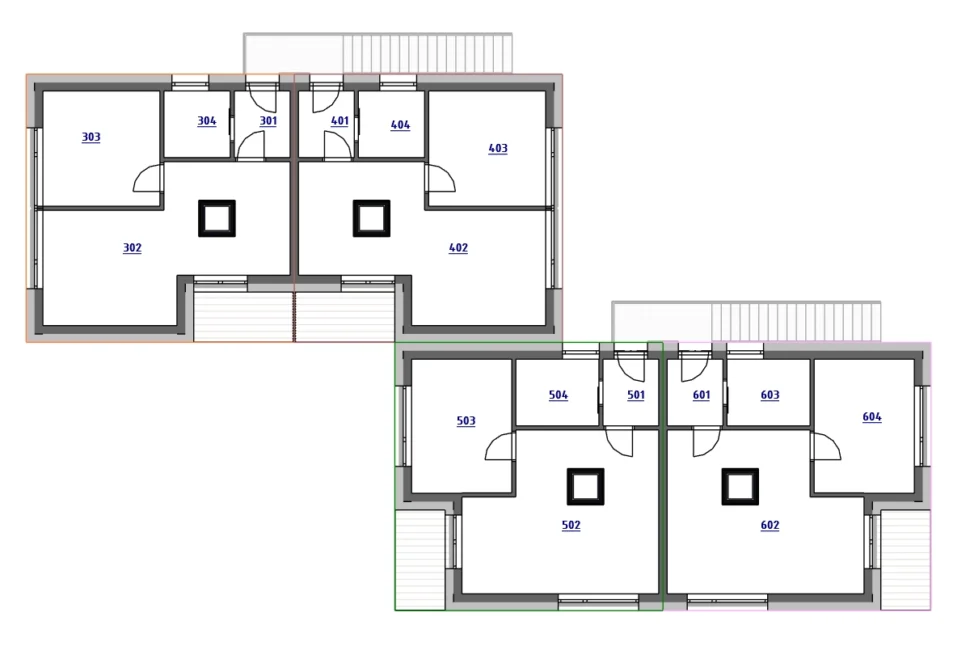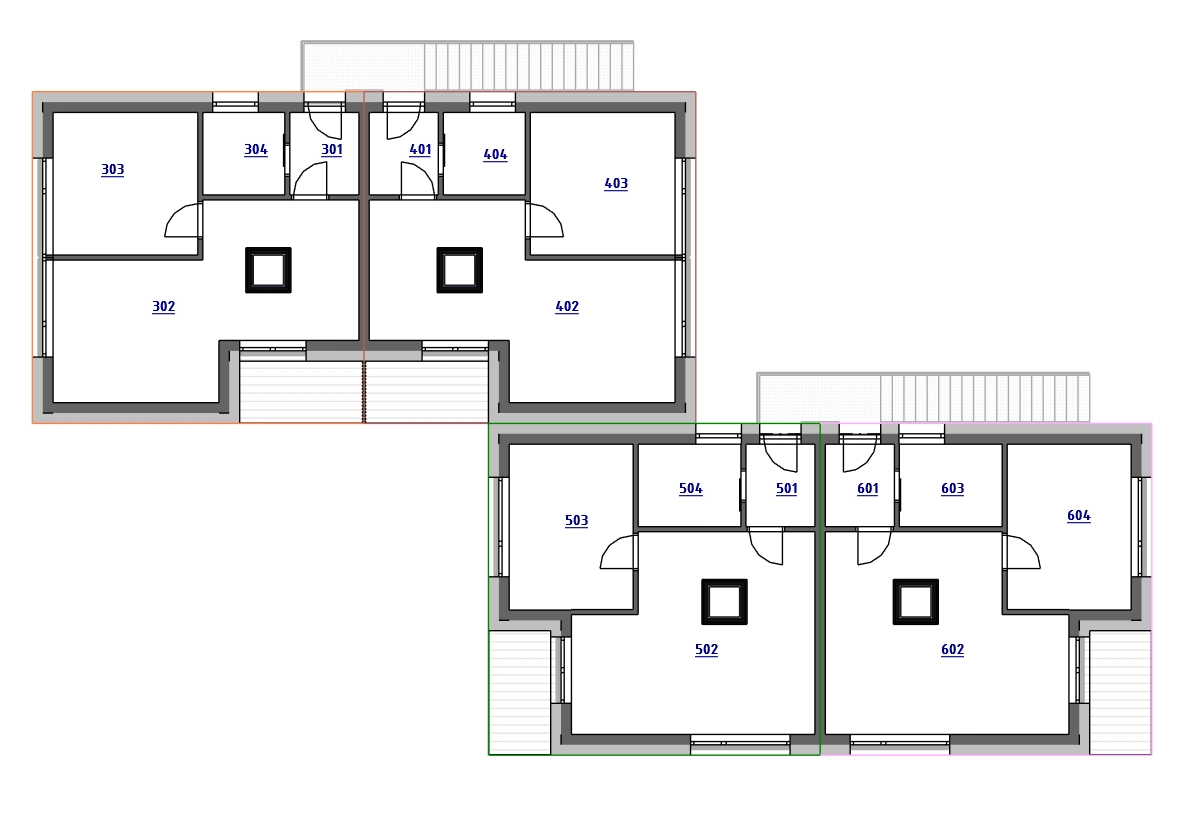 Díky rozvržení bytů je zajištěno soukromí každé domácnosti a současně jednoduchá orientace v objektu.