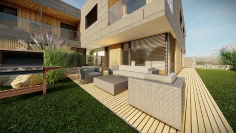 mají vlastní zádveří, technickou místnost, koupelnu s WC, obytný prostor s kuchyňským koutem a přímý vstup na terasu. Součástí je jedna nebo dvě ložnice.