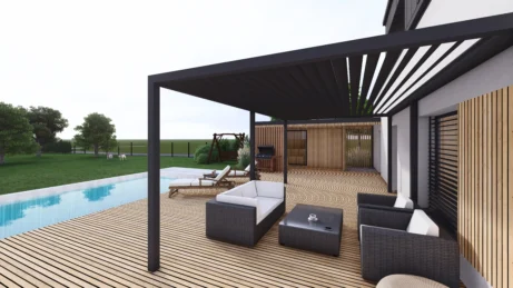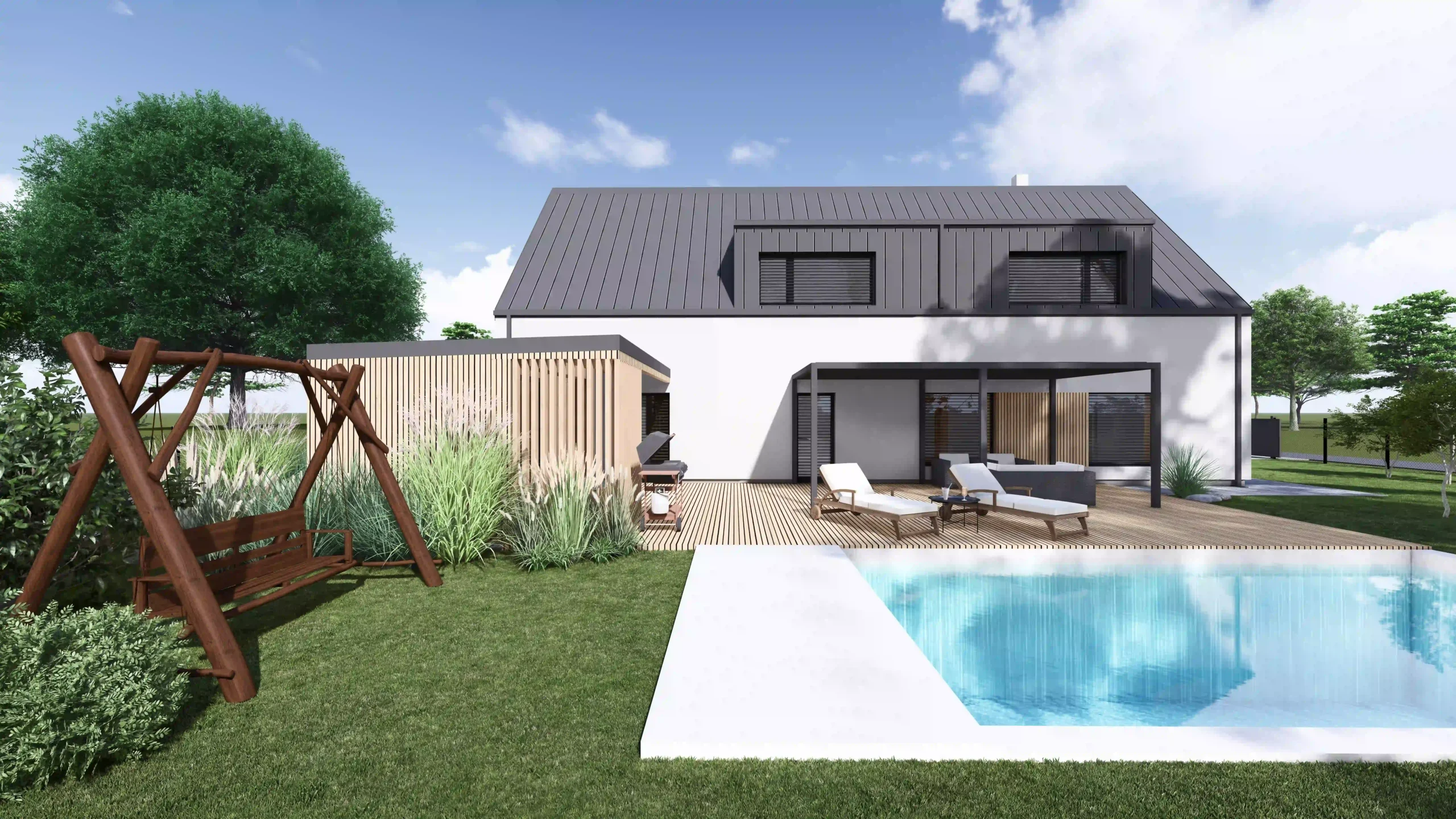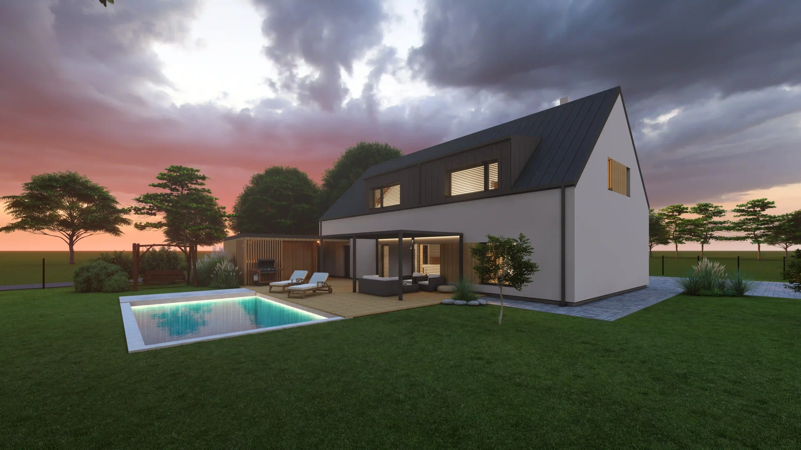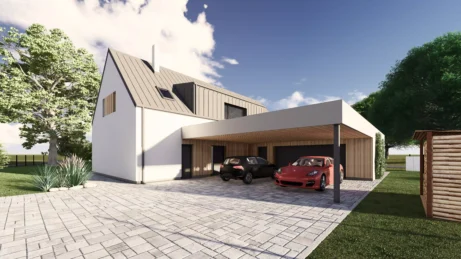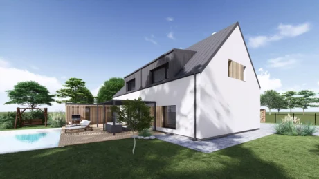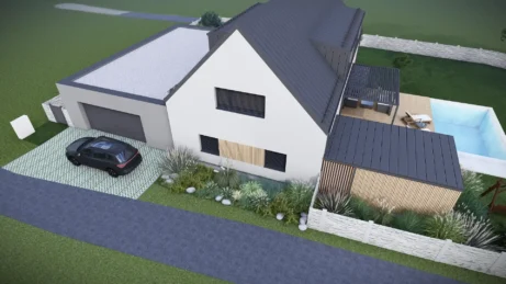 Na klidném a prostorném pozemku v severní části obce Libhošť probíhá komplexní proměna původního jednopodlažního domu na moderní a plnohodnotně využitý dvoupodlažní objekt s obytným podkrovím, novou přístavbou garáže s krytým stáním a saunovým domkem propojeným s hlavní stavbou. Projekt spojuje výhody rekonstrukce s novostavbou – zachovává původní charakter místa a zároveň přináší současný komfort a funkčnost.