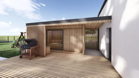 Jako doplňkový prvek navazuje na dům samostatně stojící saunový domek, situovaný tak, aby byl dostupný „suchou nohou“ přímo z koupelny. Jedná se o kompletizovaný výrobek s plochou střechou, který funkčně rozšiřuje relaxační zónu domu.