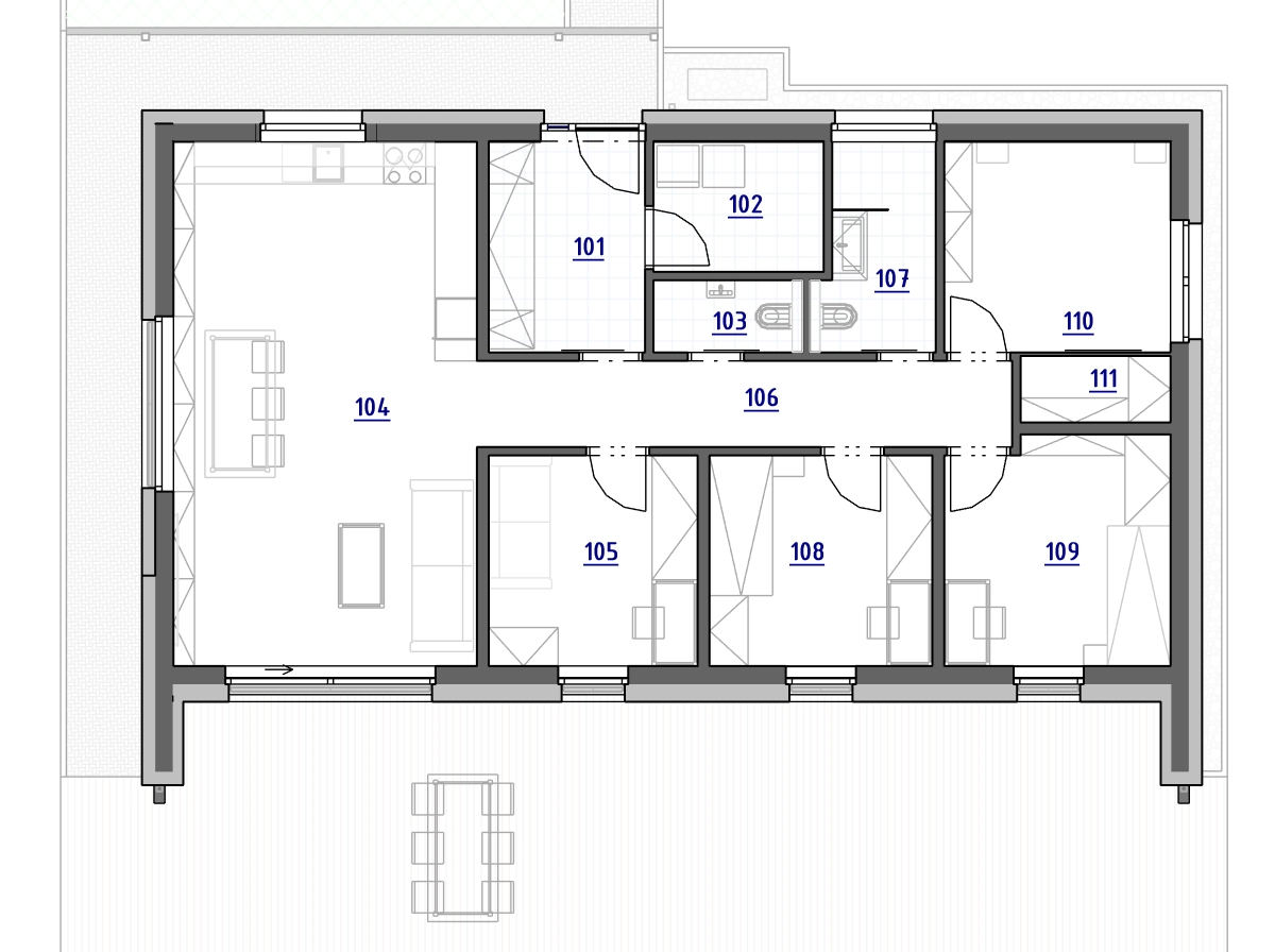 Rodinný dům je navržen jako jednopodlažní nepodsklepený objekt se sedlovou střechou o rozdílných sklonech (15°/40°). Dispozice je přehledná a praktická – s důrazem na komfort každodenního užívání pro čtyřčlennou domácnost.