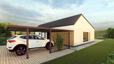 Kryté stání o rozměru 6 × 7 metrů bude sloužit jako pohodlné parkování s ochranou před nepřízní počasí. Konstrukčně je navrženo jako subtilní, ale stabilní zámečnický prvek s plochou střechou o sklonu 3 % a výškou 2,4 metru. Zastavěná plocha krytého stání je 47,5 m².