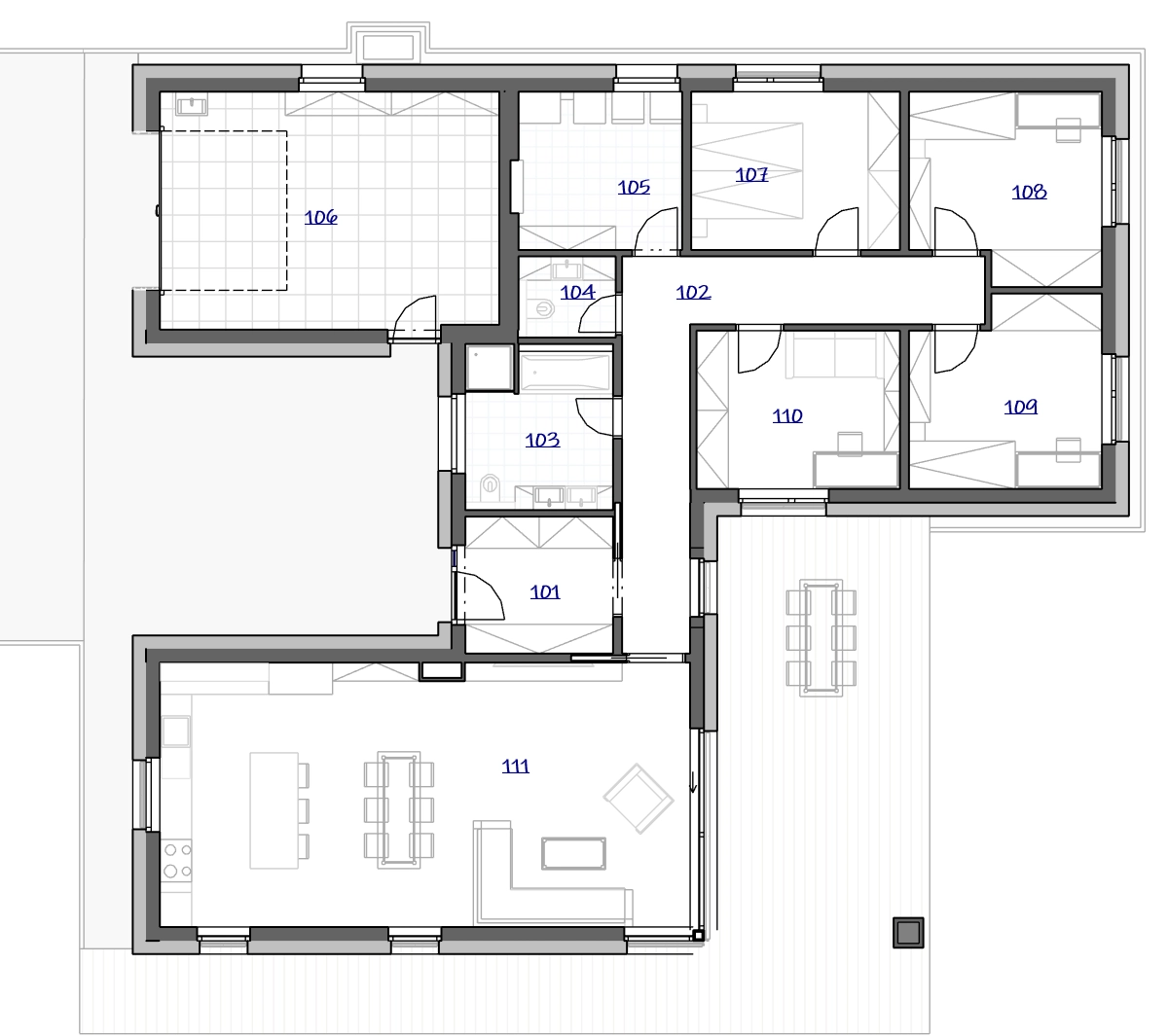 Dispozice domu je orientována na pohodlí čtyřčlenné rodiny. Vstupní zádveří ústí do chodby, která propojuje obytnou část se zbytkem domu. Obývací pokoj, jídelna a kuchyně tvoří vzdušný společenský prostor s velkými prosklenými plochami a přístupem na terasu. V klidové části domu se nachází ložnice, dva dětské pokoje, pracovna, dále technická místnost, koupelna a WC. Garáž je přístupná jak zvenku, tak ze zádveří, což usnadňuje každodenní provoz.