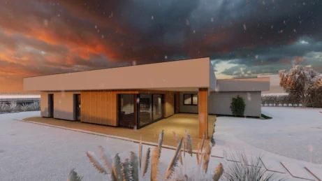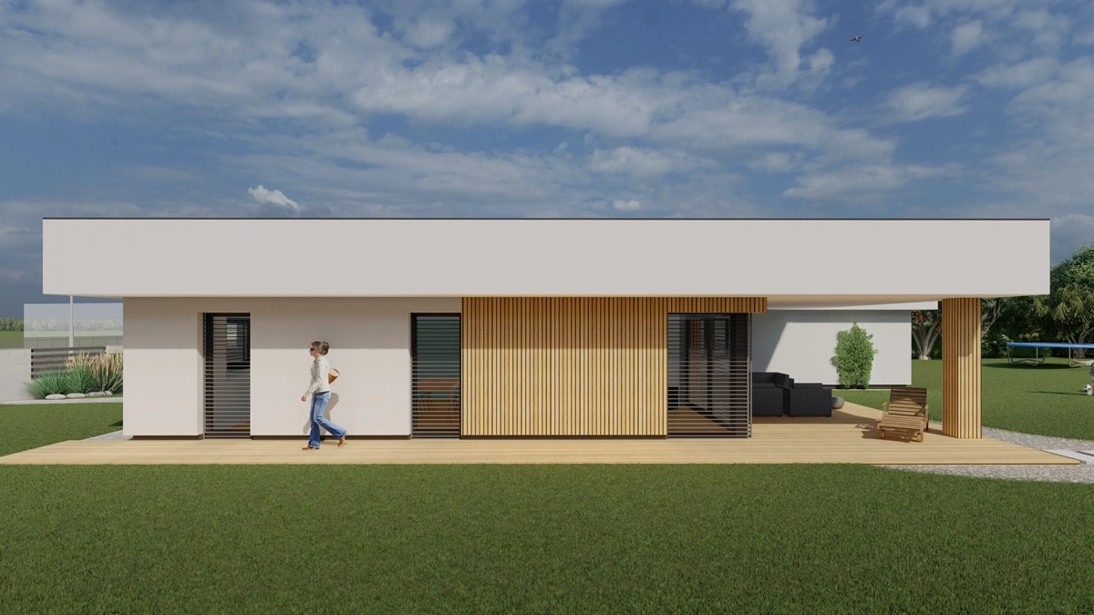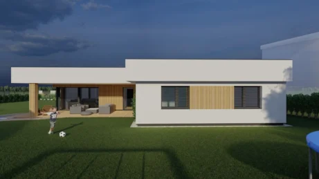 Dům je navržen jako nízkoenergetický, s důrazem na jednoduchost, funkčnost a moderní design. Stěny z pórobetonových tvárnic, zateplení systémem ETICS a kombinace omítky a dřevěného obkladu na fasádě zajišťují stabilitu, tepelnou pohodu a vizuálně příjemný kontrast. Plochá střecha chrání před přehříváním a podtrhuje čisté linie stavby.