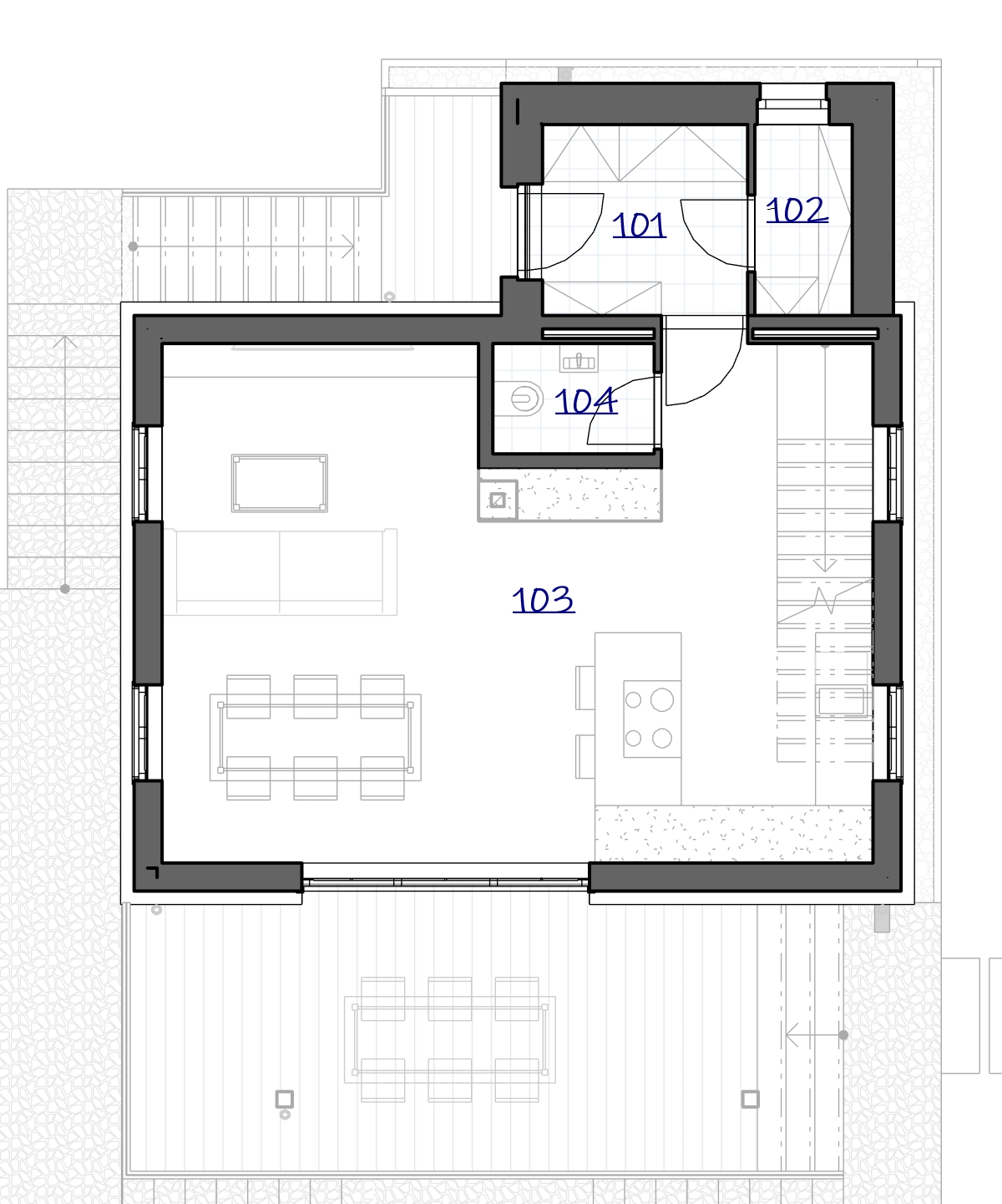 Součástí projektu je i kryté stání pro osobní automobil, napojené na nově budovaný sjezd z účelové komunikace. Přístup k domu zajišťuje systém kamenných schodišť a zpevněných ploch, citlivě zasazených do svahu. Zahrada bude ponechána k individuálnímu využití – ať už pro relaxaci, výsadbu nebo drobné zahradní stavby.