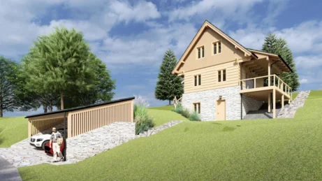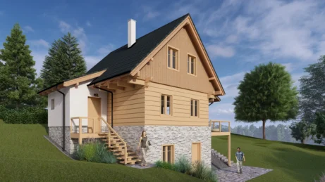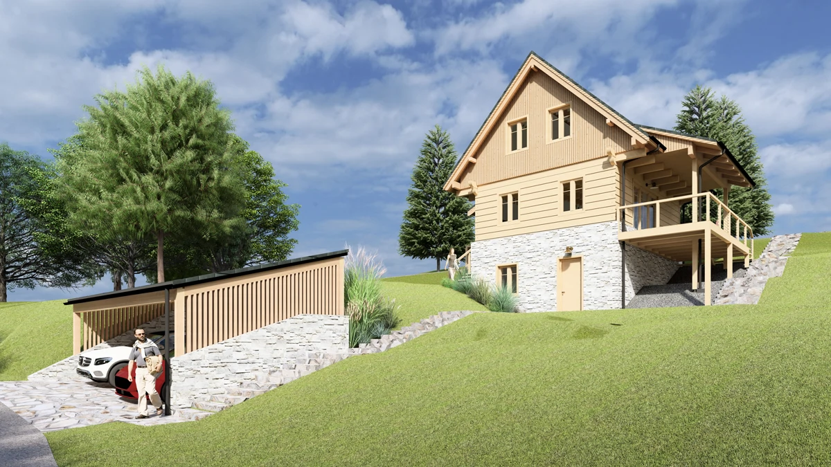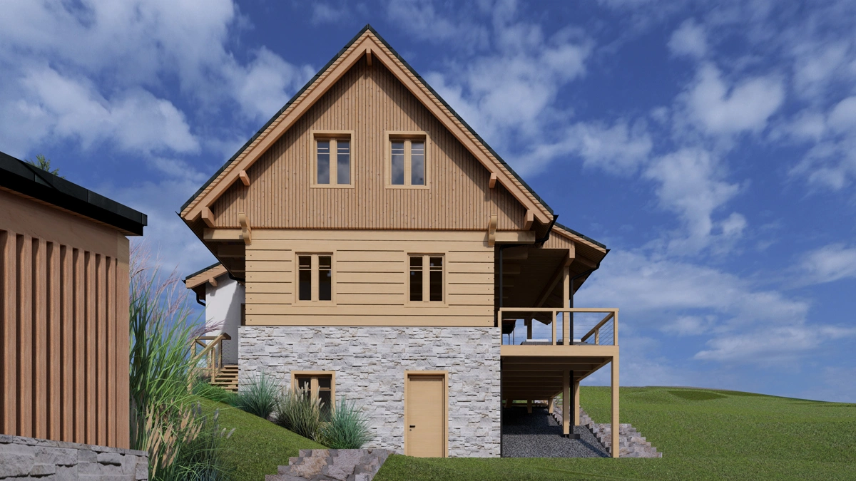 Na svahovitém pozemku v okrajové části města Frýdek-Místek, v klidném prostředí katastru Skalice, vzniká jedinečný rodinný dům s obytným podkrovím, suterénem a krytým stáním. Projekt je navržen s maximálním respektem k terénu i okolní krajině – kombinuje tradiční roubenou konstrukci s moderními technickými řešeními, aby nabídl komfortní, a přitom citlivě zasazené bydlení pro tříčlennou rodinu.