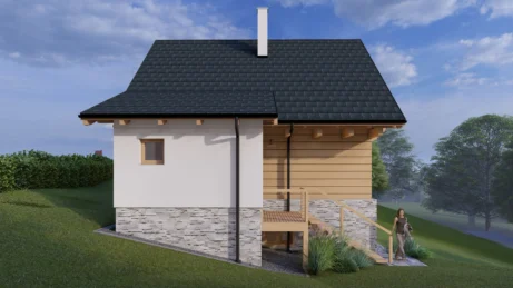 Architektura domu pracuje s kombinací materiálů – roubené stěny jako dominantní prvek, doplněné zděnou přístavbou zateplenou systémem ETICS, štítovými stěnami s dřevěným obkladem a sedlovou střechou s keramickou krytinou. Okna a dveře jsou dřevěná s izolačním trojsklem a elegantními šambránami.